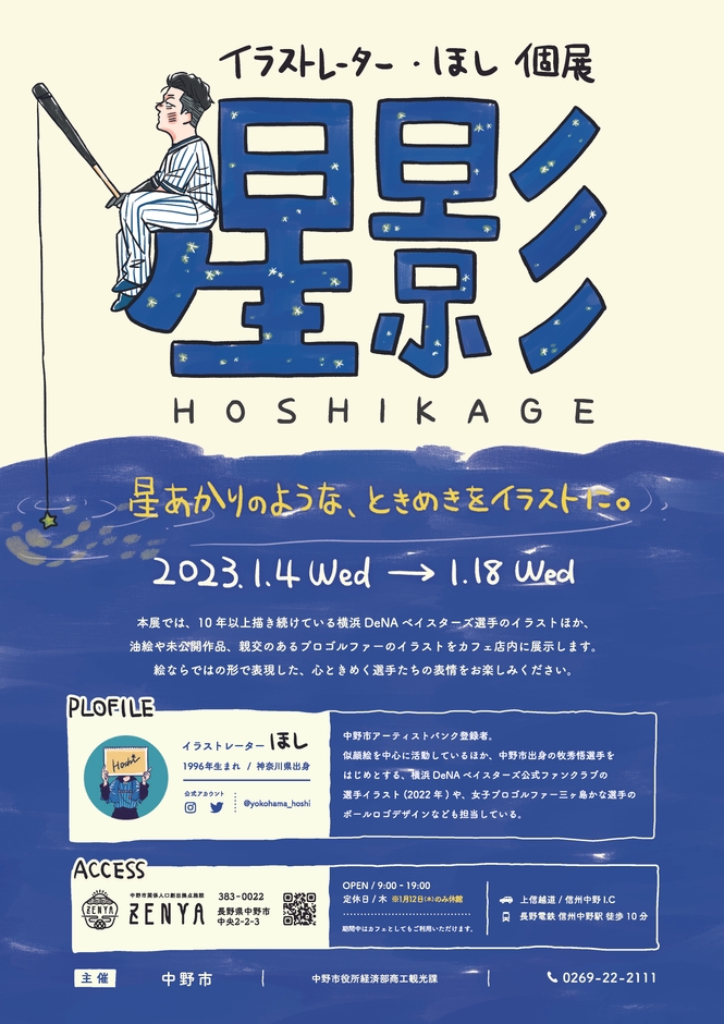 中野市関係人口創出 拠点施設「ZENYA」で、横浜DeNA ベ イスターズ公式ファンクラブの選手イラストを担当するイラストレーター「ほし」さん(神奈川県在住)の個展を開催します。