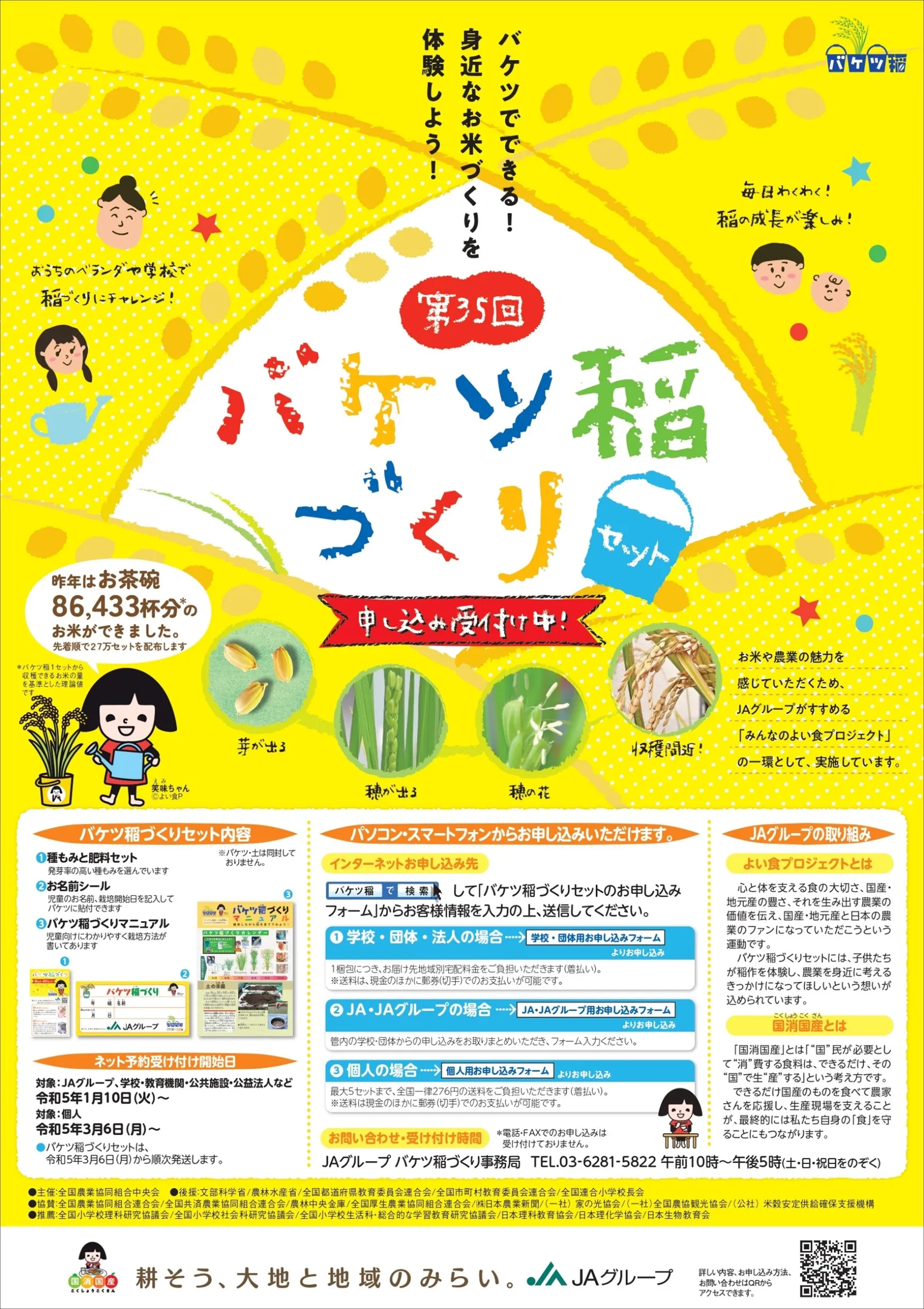 お家のベランダや学校で稲づくりにチャレンジ! 配布開始から1,120万セットを突破! 身近な場所で食育体験「バケツ稲づくり」 令和5年1月10日(火)より先行予約申込受付開始
