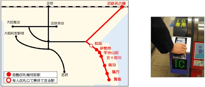 近鉄名古屋駅、伊勢市駅、宇治山田駅、五十鈴川駅、鳥羽駅、鵜方駅、賢島駅の計7駅の一部の自動改札機にQRコードリーダーを設置しています。