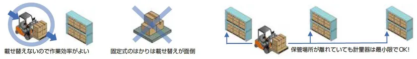商品情報と合わせて保管場所を入力すれば入出庫や移動の際も正確な現品管理ができます。バーコード読み取りでの保管場所登録も可能です。また、フォークリフトやハンドフォークがそのまま計量器になるので運搬時の載せ替えの手間もありません。