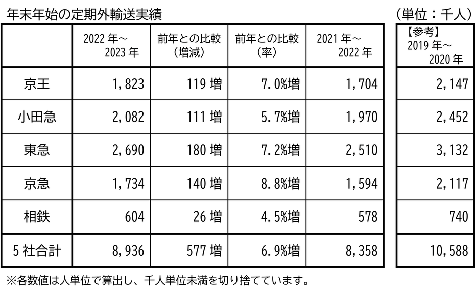 年末年始の定期外輸送実績は、前年から6.9%増加【神奈川県内大手民鉄5社】