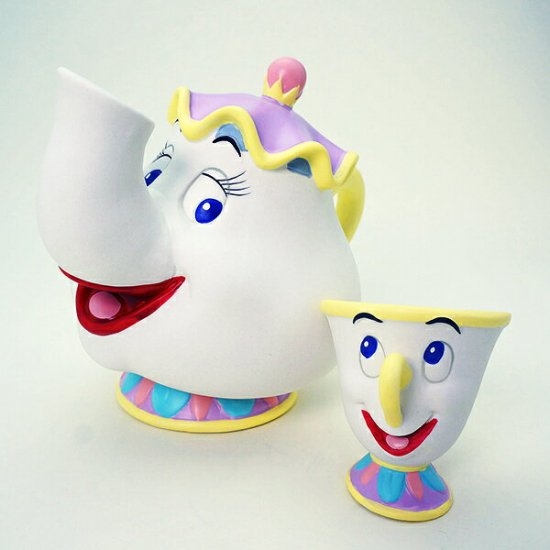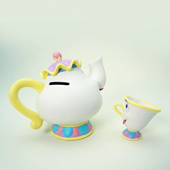 ポット夫人とチップの貯金箱です。ルミエールと一緒に並べればより美女と野獣の世界観がお部屋にうまれますよ♪