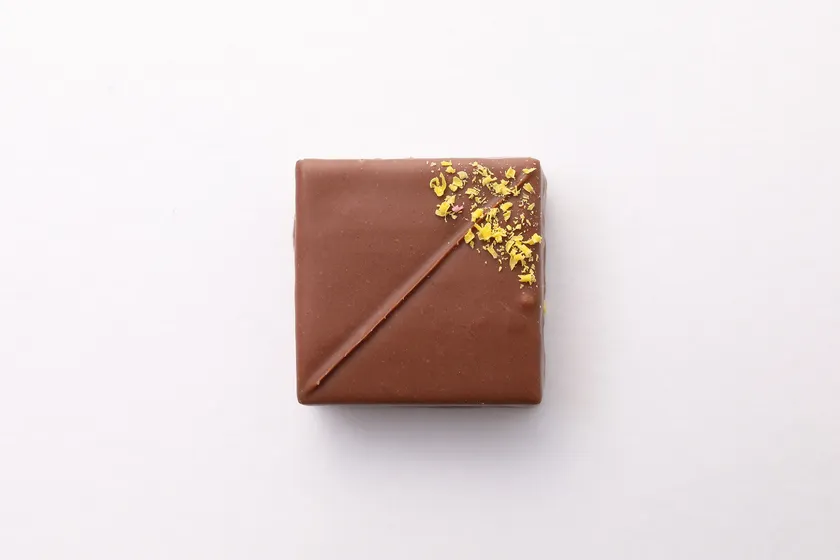 上品な苦味と自然豊かな香りの中に漂うフローラルな香りが特徴のショコラを使用し、丁寧に抽出したジャスミンの華やかな香りをまとったガナッシュの上に、高知県産の柚子を練り込んだホワイトショコラを薄く忍ばせました。