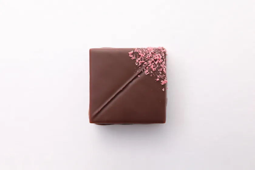 シャープな後味のショコラを使用し、バラの優美な香りがもたらす華やかで上品なガナッシュを、香り高く爽やかな酸味のフランボワーズを練り込んだショコラでサンドし、贅沢に3層に仕上げました。
