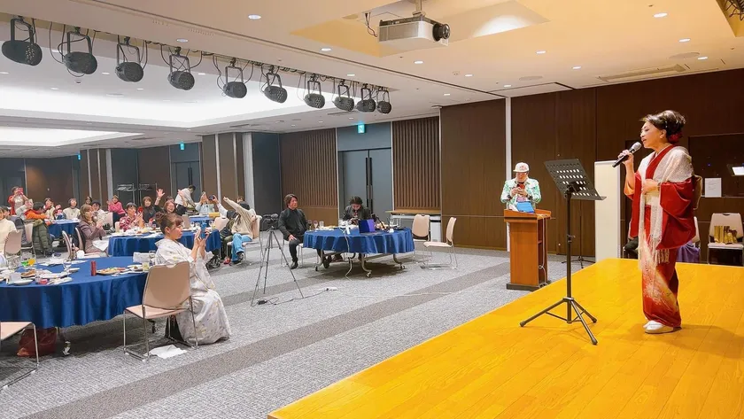 小谷幸のステージでは、JOSTARジョウ☆スター作詞作曲の『秋吹く風は京都恋落ち葉』を披露、優雅な着物と『小田原 天成園』のステージが美しさを演出しフルコーラス歌いきり拍手歓声でステージに花を咲かせました。