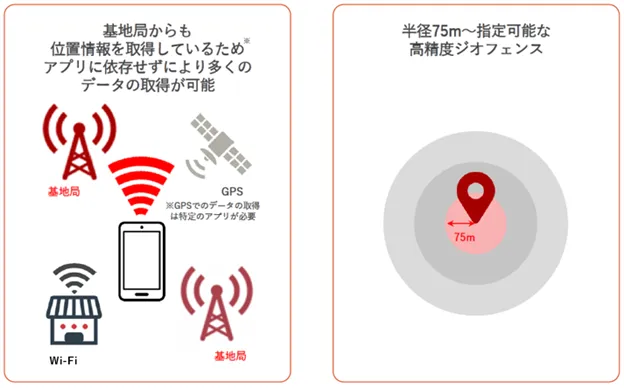 ドコモの基地局やWi-Fiの通信情報をもとに、指定した位置から半径75mのエリア内にいる顧客を推定することができる「docomo Ad network」(※7) の位置機能を活用し、指定したエリアに来訪したターゲットユーザーにリアルタイムでメッセージ配信などを行うことが可能です。