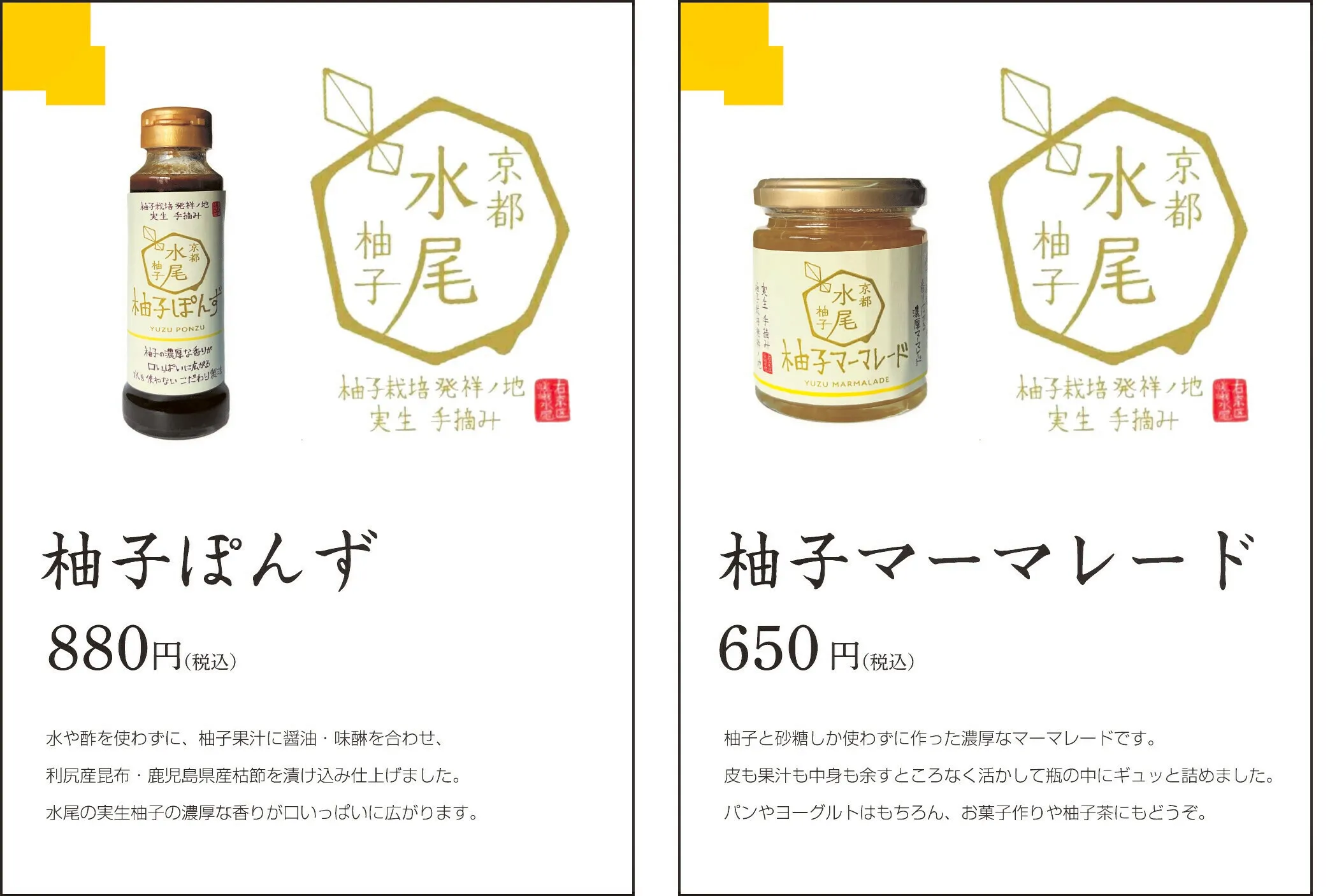 「水尾の里 PR特設ブース」では、魅力あふれる水尾地域をパネルで紹介するとともに、期間中の土曜日・日曜日には、水尾の柚子の中でも特に希少価値の高い「実生柚子(みしょうゆず)」※を使用した、マーマレード、ポン酢など加工商品の販売を行います。
