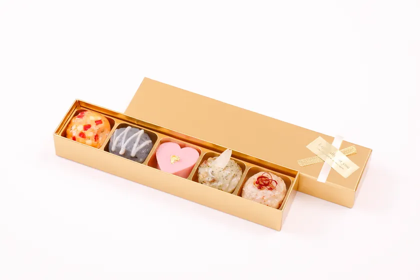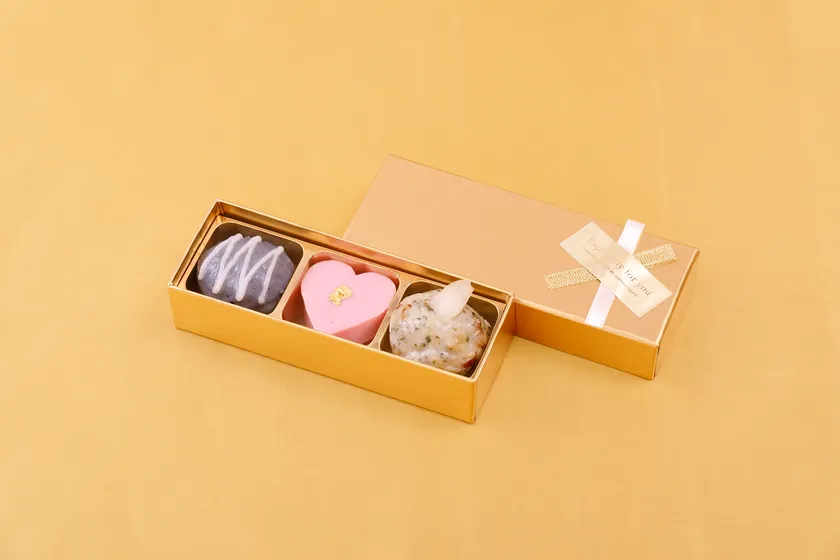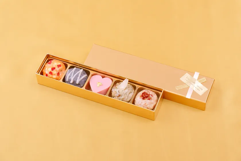 煌びやかなゴールドの小箱に金リボンを飾ったパッケージは、プレゼントへのワクワク感をかきたてます。一口サイズのプチさつま揚げは宝石のようにカラフルで、また金箔やトリュフソースなど高級感ある素材をふんだんに使用。見た目も味も豪華な、その名の通りプレミアム感いっぱいのバレンタインギフトは、喜ばれること間違いなし!