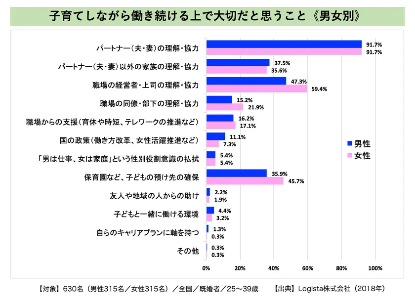 600名の既婚者を対象に「子育てしながら働き続ける上で大切なこと」を調査した際、男女ともに約92%が「パートナー(夫・妻)の理解・協力」が大切と回答。他の項目よりも圧倒的に重視されていることが分かりました。本研修は、こうした当事者の本音に寄り添いながら、育児期の家庭と仕事の充実に繋がる男性育休、復帰後の自律的なキャリア形成を後押しします。