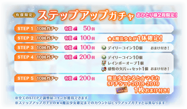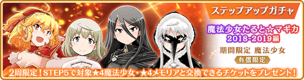 また、本ガチャの開催と合わせて『期間限定 魔法少女たると☆マギカ2018-2019 ピックアップガチャ』をお得に引ける『有償限定 ステップアップガチャ 魔法少女たると☆マギカ2018-2019編』を開始いたしました。