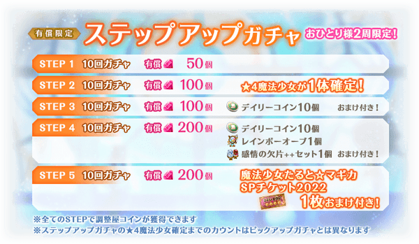 各STEPに応じて、消費する有償マギアストーンの個数や、獲得できるおまけが異なりSTEP5では対象の★4魔法少女1体や★4メモリアと交換できる「魔法少女たると☆マギカSPチケット2022」が獲得できます。