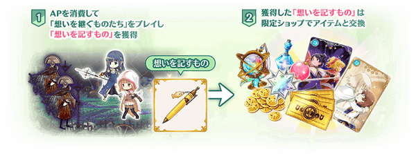 APを消費し、本イベントのクエストをプレイすることで、イベント限定ショップで限定メモリアや限定ホーム背景をはじめ、「ガチャチケット」等のアイテムと交換できる「想いを記すもの」を獲得できます。