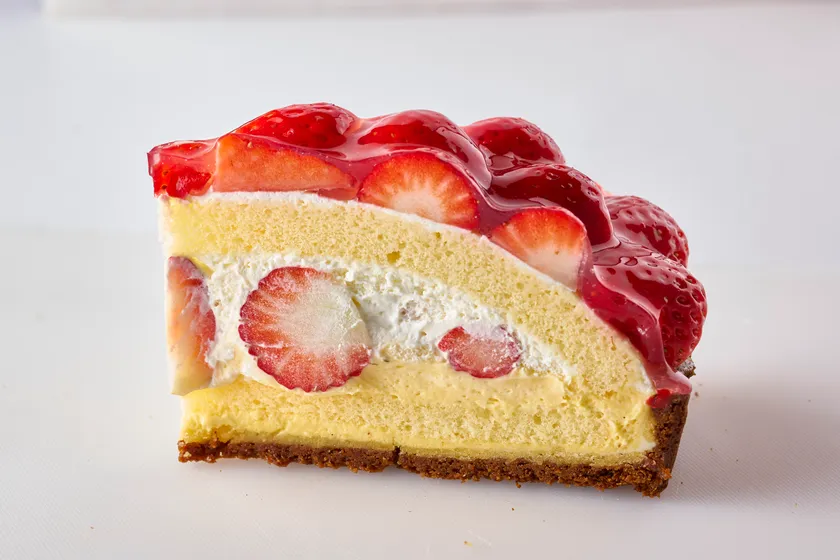 洋酒がほんのり香るスポンジに濃厚なクリームと華やかな香りに満ちたイチゴたっぷりのタルト。
