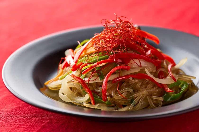 韓国春雨と牛肉、色とりどりの野菜のチャプチェに糸唐辛子と生の唐辛子をいれることで、さらに食欲が増します。