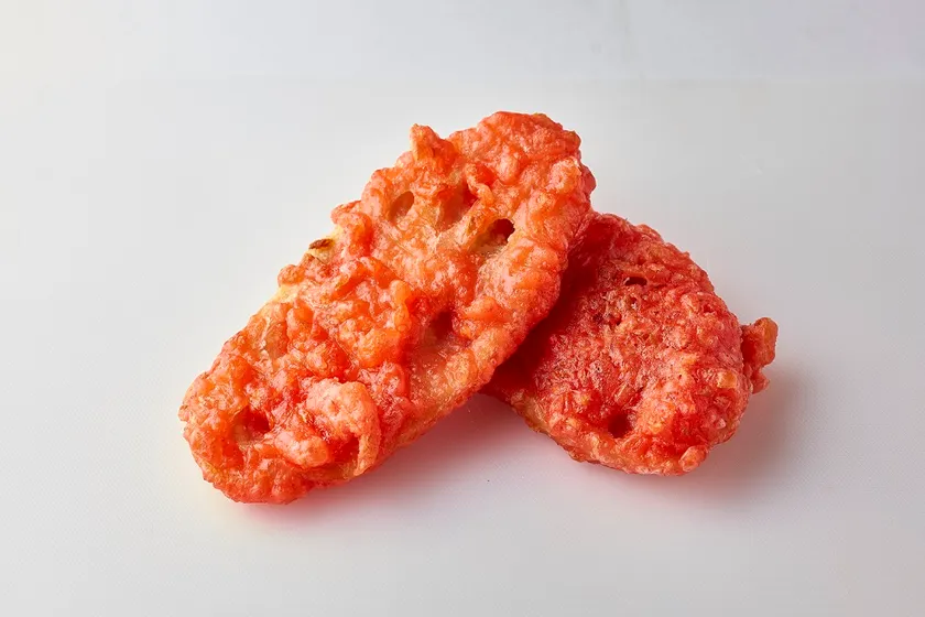 紅生姜を混ぜた赤い衣でさっぱりとしたレンコン天ぷらです。