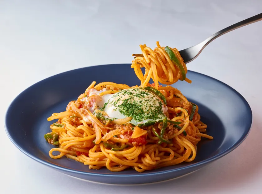 鶏そぼろと温泉卵が絶妙なこだわりナポリタン。