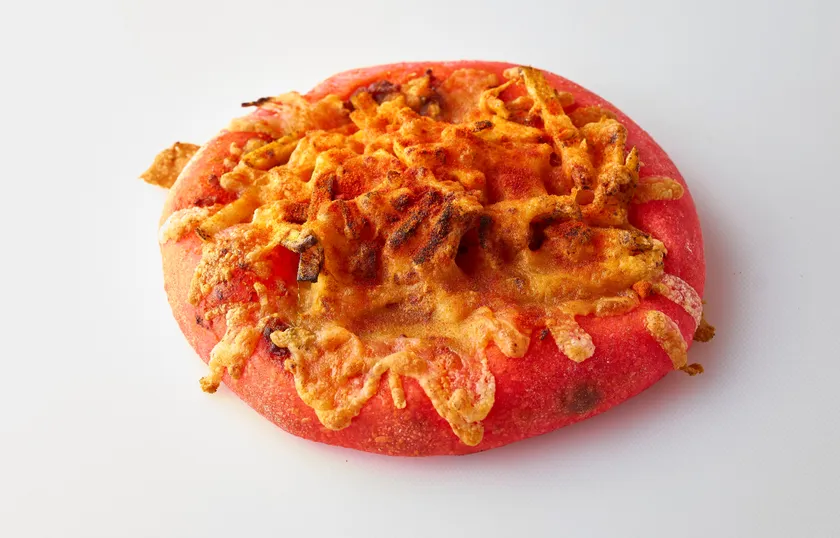 生地まで赤い!ニンニク仕立ての旨辛ホットソース「スリラチャの赤備え」をたっぷり加えた激辛ピザソースに、さらにハバネロパウダーをトッピング。
