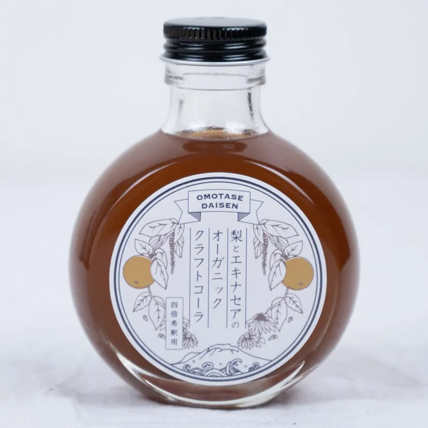 大山町産の梨と、大山町産の有機エキナセアを使用したクラフトコーラです。その他材料は有機砂糖、有機スパイス類で作り、有機JAS認証を取得しています。