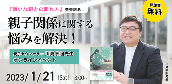 親子関係に関するお悩みを解決!おとなの親子関係カウンセラー、川島崇照先生新刊『嫌いな親との離れ方』発売記念【無料オンラインイベント】1月21日(土)13時より開催!