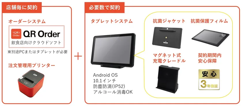 飲食店に適した仕様のタブレットPCや周辺機材とテーブルトップオーダーシステムをオールインワンパッケージにしています。お客様ご自身のスマートフォンを利用した「QR Order」と店舗で貸し出すタブレットとの併用により、少ない投資と月額費用で幅広い層で使えるセルフオーダーシステムを導入することができます。また、タブレットPCは用途を限定していないため、レジ用端末や厨房でのオーダー確認用端末としてご利用いただくことも可能です。