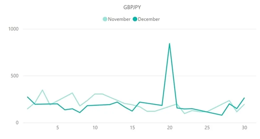 ポンド円(GBP/JPY)も、他のクロス円通貨ペアと同様に20日に急激にボラティリティ拡大を見せる形となりました。ただし、1日当たりの平均ボラティリティは、11月の約191pipsに対して12月は約261pipsと、他のクロス円通貨ペアよりも拡大しています。