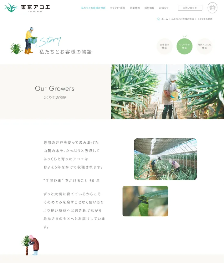 60年の月日に詰まったお客様との大切な出会いの数々や、自社農園の有機栽培のこだわり、アロエの不思議な魅力に心奪われ、その普及に生涯を捧げてきた創業者・芦川 良江と東京アロエの60年の物語を丁寧にご紹介しています。