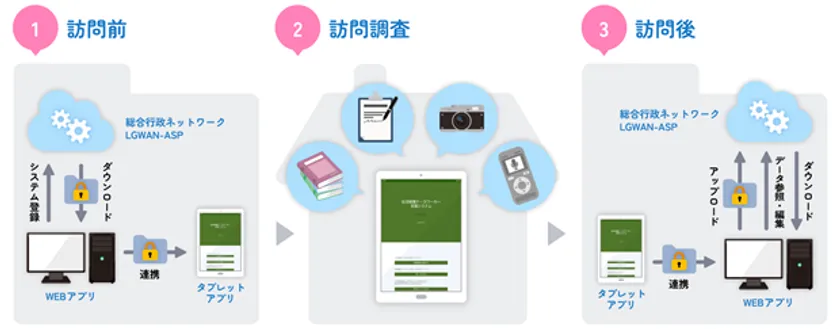 LGWAN-ASPは、非常にセキュアなネットワークを用いて、地方公共団体の職員様に行政事務サービスを提供するものです。LGWAN-ASPを用いることにより、セキュリティー担保と導入コストの削減を同時に実現できます。タブレットはオフラインで利用するため、持ち出し資料も外部流出の心配なく持ち出せます。