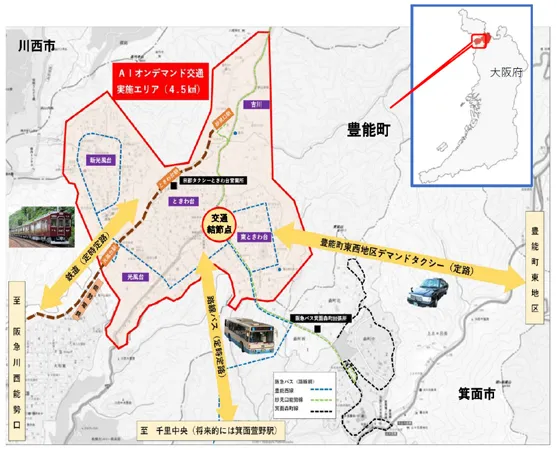 能勢電鉄妙見線・阪急バス豊能西線(北急接続)を広域基幹交通として、域内移動をAIオンデマンド交通の導入により、ハブ&スポーク型の地域交通体系へ転換し、効率的な運行ネットワークを形成することを目指します。
