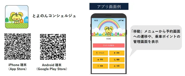 「とよのんコンシェルジュ」アプリから配車用アプリへの連携で予約・乗車いただくと、乗車ポイントが貯まります。貯まったポイントは、町内の加盟店で使えるなど、お得に乗車することができます。