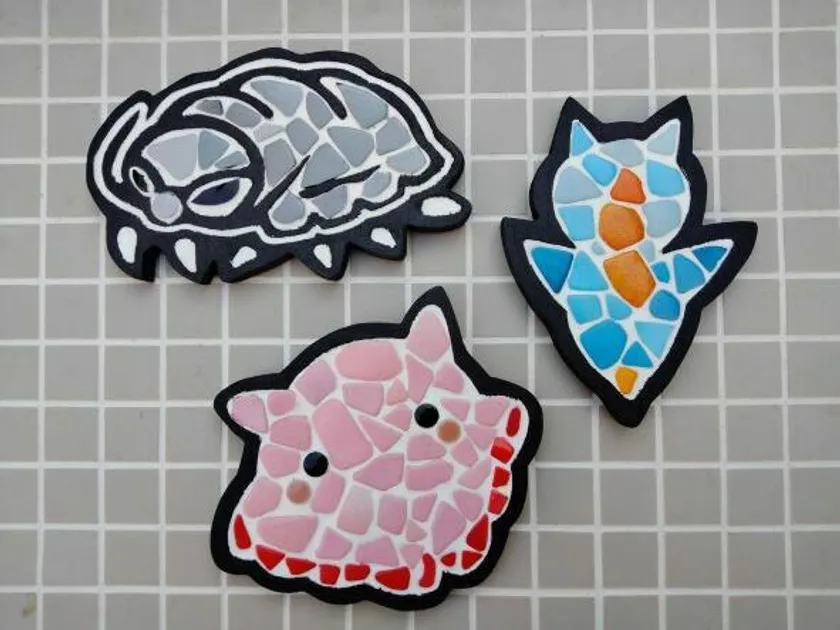 ダイオウグソクムシ、メンダコ、クリオネデザインの下地から一つ選び、好きなタイルで彩ります。目地に使用する紙粘土は蓄光性で暗い所で光ります。