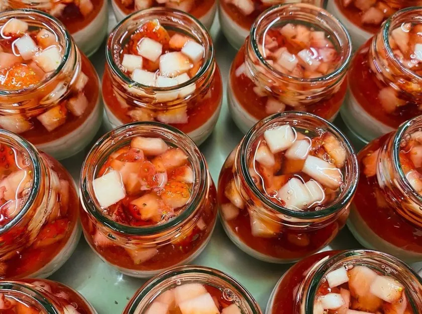 たっぷりの苺の果肉を苺風味の柔らかなジュレで閉じ込め、みずみずしくのど越しよく仕上げています。