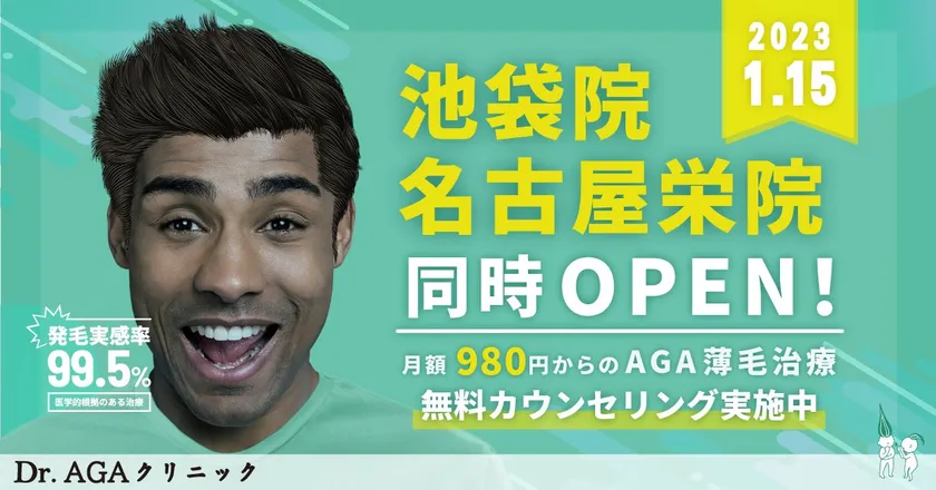AGA・薄毛治療専門外来 Dr.AGAクリニック(総院長:坂口 海雲)は、全国9院目となる『Dr.AGAクリニック名古屋栄院』(院長:田中 康地)を2023年1月15日に開院いたします。また、同日2023年1月15日に東京都豊島区に『Dr.AGAクリニック池袋院』(院長:可世木 久幸)を開院いたします。