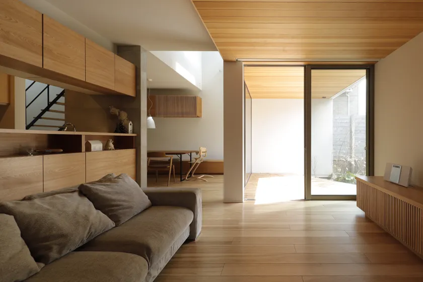ウッドデッキとフラットにつながるLDK 天井と軒裏の素材を揃えて広がりを演出