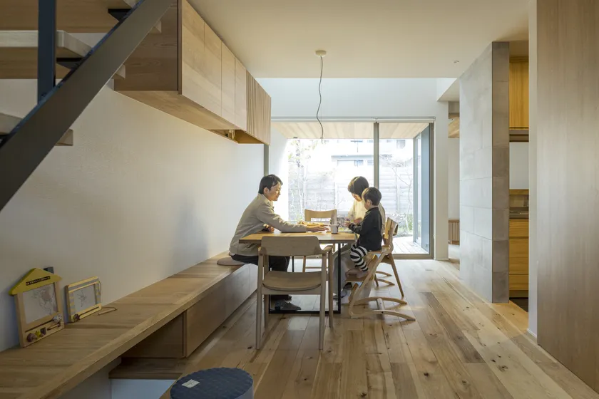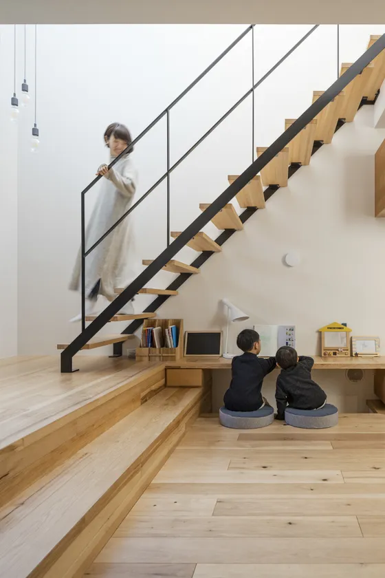 階段下からつながる約4.5メートルの長いベンチは、ダイニングテーブルの椅子にもなれば、足を入れられる掘り込みを利用して、子どもたちのスタディスペースにもなります。