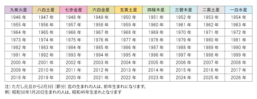 こちらの早見表を参考に、ご自身のお子さんの本命星をご確認ください。