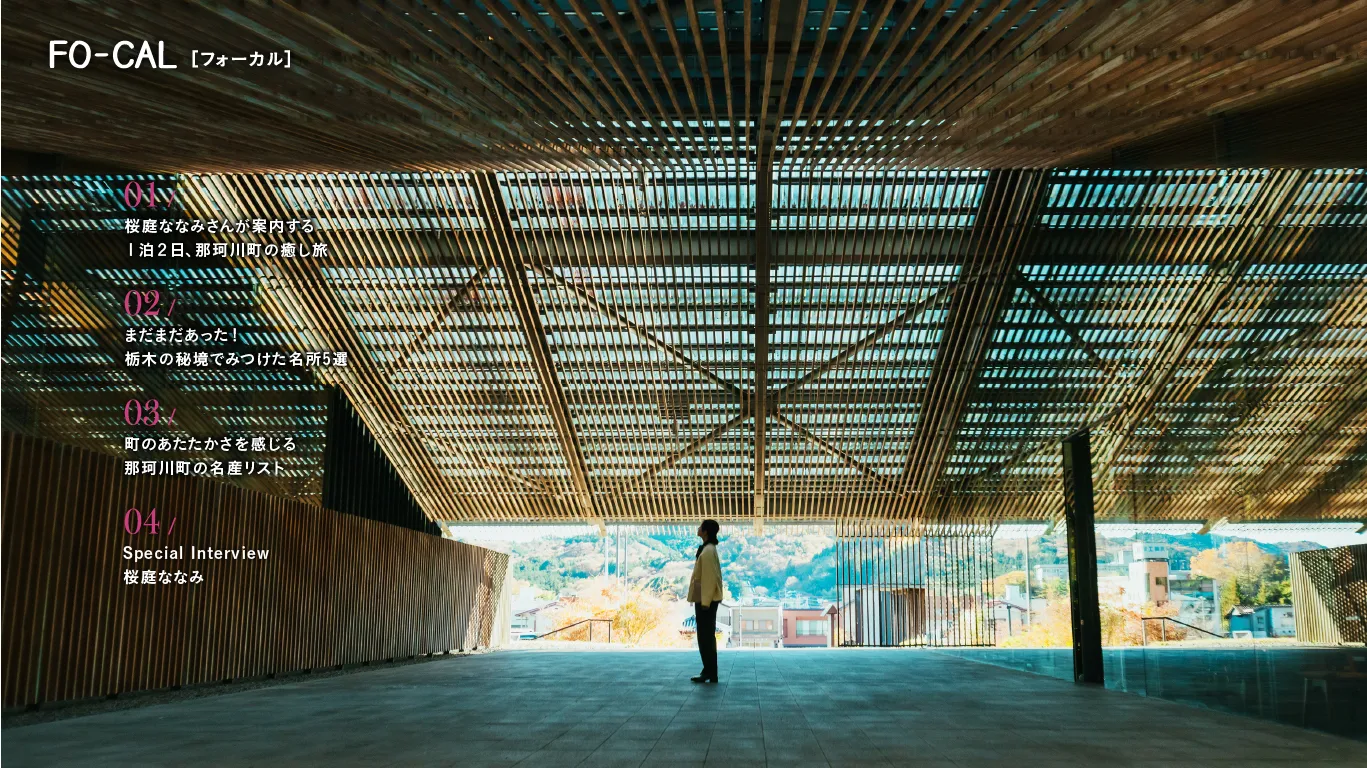 桜庭ななみさんと訪れたのは豊かな自然のもと、穏やかな時が流れる那珂川町。温泉や美術館、伝統工芸品の工房やカフェなど、さまざまなジャンルの個性あふれる施設が点在します。美術館が、周囲の環境に溶け込むよう地元産の八溝杉を使用した建物だったり、桜庭さんが1年間で1番好きだというクリスマス気分を年中味わえる雑貨店は木々に囲まれる空間だったりと、どれも町の自然と調和しているのが魅力です。初めての古民家での宿泊も体験した桜庭さんは「自然をたくさん感じて気持ちよかった」とリフレッシュできたようです。そんな那珂川町での旅の様子はぜひ本誌をご覧ください。また、桜庭さんに那珂川町を案内してもらっているかのような旅ムービーも公開中です。