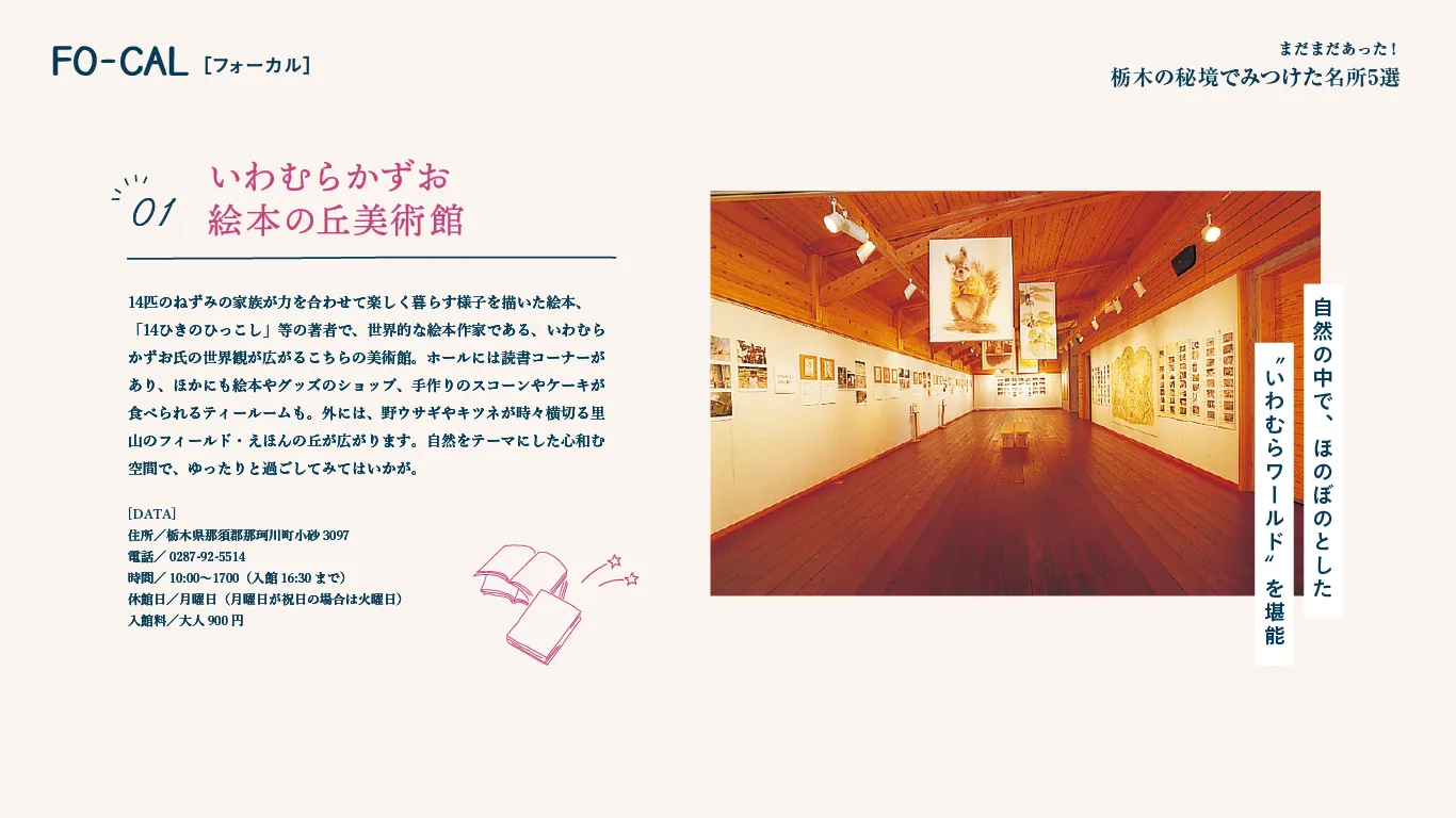 那珂川町は、絵本の世界観と自然が調和する美術館や、個性的なお土産品が並ぶお店、景観とともに地元食材を楽しむカフェなど、地域資源を生かしたスポットに溢れており、全国旅行支援の活用もおすすめです。古くから受け継がれてきた文化や想いがつくる魅力溢れる町の、立ち寄りたい名所をまだまだご紹介!