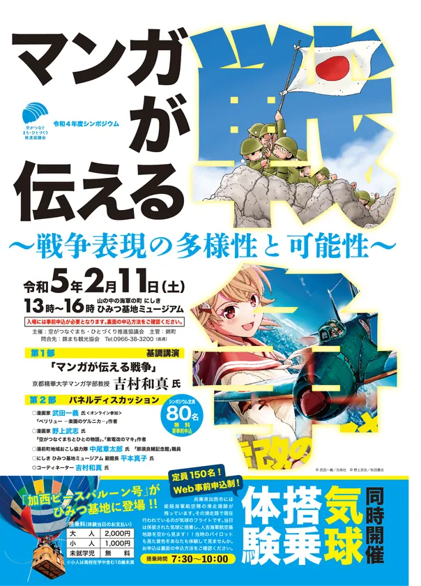 空がつなぐまち・ひとづくり推進協議会(事務局:兵庫県加西市北条町横尾1000番地 加西市役所、会長:西村 和平)は、シンポジウム「マンガが伝える戦争~戦争表現の多様性と可能性~」を2023年2月11日(土)、熊本県錦町の錦町立人吉海軍航空基地資料館(にしき ひみつ基地ミュージアム)で開催します。