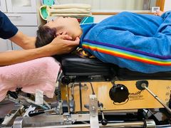 頸椎は7個あり、主に頸椎上部を頸椎調整により治療しました。頸椎にある3つの突起を使い行います(後ろに一つ、左右に一つずつ)。突起の並びを触診により確認し、頸椎のねじれを判断します。頸椎にねじれや、圧迫がある箇所の治療を頸椎調整により行い、この頸椎のねじれや圧迫を取り除くことにより神経の圧迫を取り除きます。頸椎にねじれや圧迫が生じると、椎間孔(脊椎と脊椎の間の孔)が狭くなり、そこから出てくる神経を触ってしまうため、頸椎調整(脊椎調整)により、このねじれや圧迫を取り除く治療を必要とします。