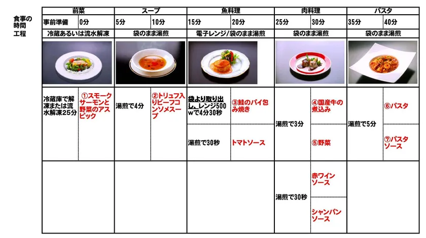 お料理を召し上がっているときに並行して湯煎で温める、電子レンジで短時間調理…それらの工程を組み合わせてプログラム化することで「会話できる時間の確保」を実現することができました。