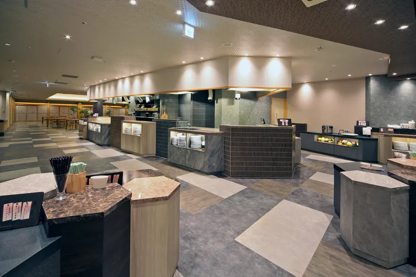 清風荘は、昔から多くの文人墨客に愛されてきて開湯140周年を迎えるあわら温泉にて、創業70周年の節目に元々のバイキング会場として使用していた風のダイニング「風和里」の拡張リニューアル工事を計画、東尋坊をイメージして六角形を組み合わせてデザインしたビュッフェカウンターや盛り台は地元色にこだわり、スタッフの動線も強く意識して生産性向上を図るなど、約1年半の構想を経て完成しました。