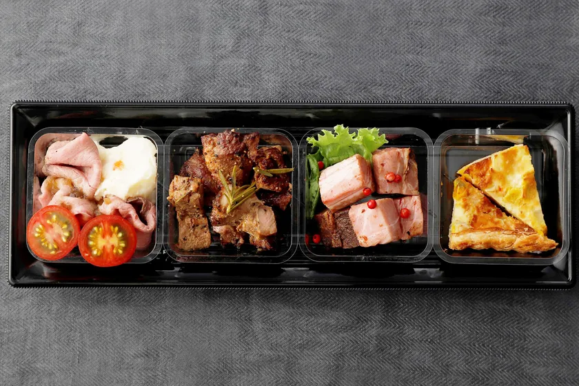 味わい深いローストビーフ、ローズマリーが香るスパイシーなスペアリブ、醤油ベースで味付けをしたローストポークなどの贅沢な肉料理と、キッシュを盛り合わせました。