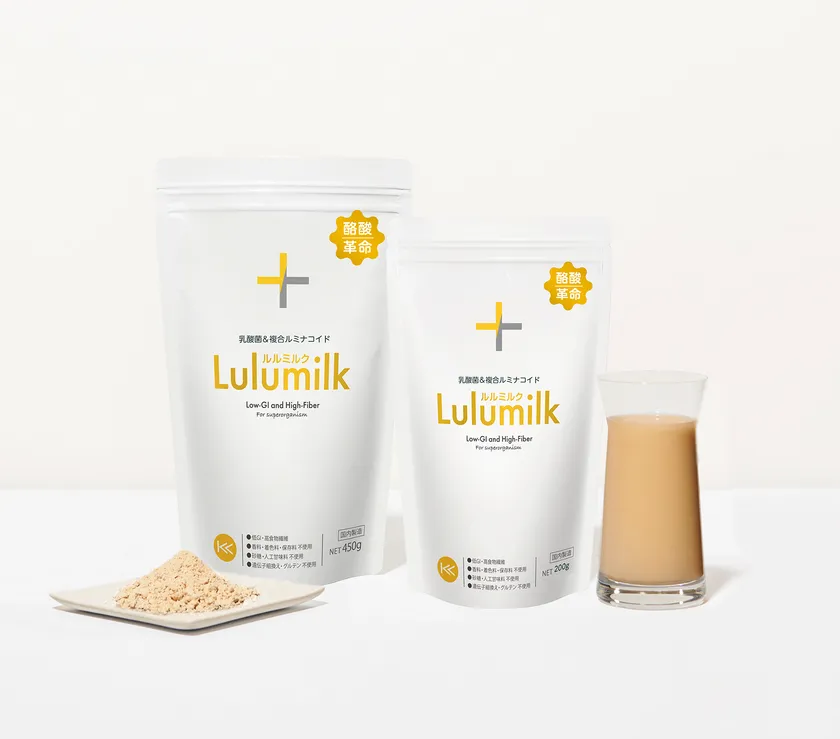 「Lulumilk(ルルミルク)」は、腸内フローラが代謝する「短鎖脂肪酸(酪酸、プロピオン酸、酢酸など)」をより多く、効率的に産み出すよう、「ルミナコイド」と乳酸菌を配合した、全く新しい腸活・健康食品です。