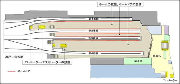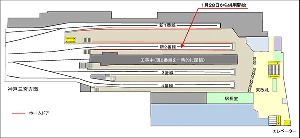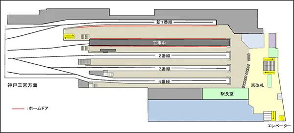 また、新2番線の供用開始に併せて、ホームからの転落事故等の防止策として、国、大阪府及び大阪市の補助を得て整備している新2番線ホームのホームドアも供用を開始します。なお、現在の2番線は、既存躯体の改築やホームドアの整備などを行うため一時的に閉鎖いたします。