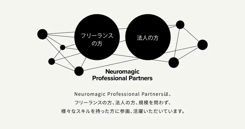 「EXPERIENCE AGENCY」を掲げ、デザイン(※)の力でクライアントの課題を解決する、株式会社ニューロマジック(本社:東京都中央区、代表取締役社長:黒井 基晴、以下 当社)は、協業パートナー=NPP(Neuromagic Professional Partners)を常時募集しています。現在、フリーランス、法人、規模の大小を問わず、様々なスキルを持つ100名以上が在籍中です。2022年12月より、社員のみ受講可能だった社内スクール制度「NM dojo」も、NPPからエントリー可能になりました。2023年に創業29周年を迎える当社は、企業文化を共有できる企業・個人と協業し、事業を展開し、拡大・成長していきたいと考えています。