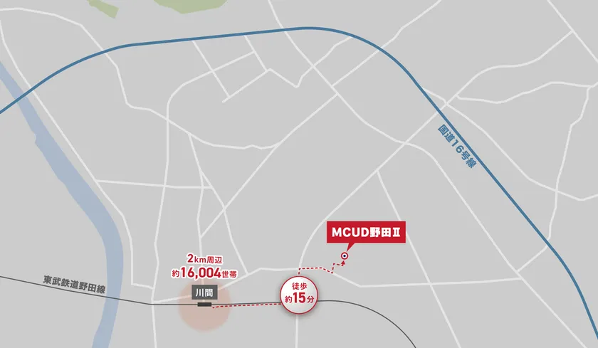 「MCUD野田II」は、首都圏の主要な地区を環状に囲むように結ぶ国道16号線の近くに立地し、常磐自動車道「柏」ICと、東北自動車道「岩槻」ICの二つのICを利用することで、東京・関東エリアへのスピーディーな配送を実現いたします。