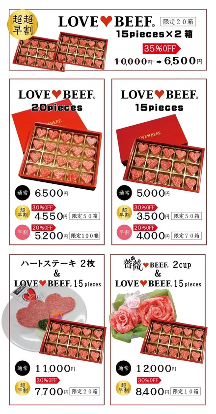 当社は、美味しいお肉をお届けするというミッションは当然のこととして取組んできましたが、お肉を愛してやまない!肉愛好家集団として愛する肉をいろいろなカットにより「食べる楽しみ」だけでなく「見る楽しみ」を味わっていただきたい!と日々研究を重ね、LOVE BEEFボックスを生み出しました。肉好きさんへのギフトとして、または焦げる程の思いを伝えたい方へのギフトとしてご利用いただければ幸いです。