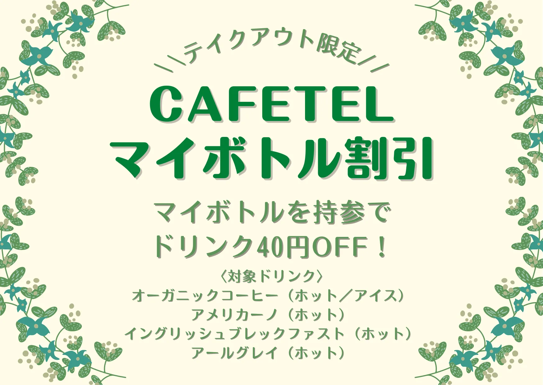 マイボトルをご持参で、ドリンク40円OFF!