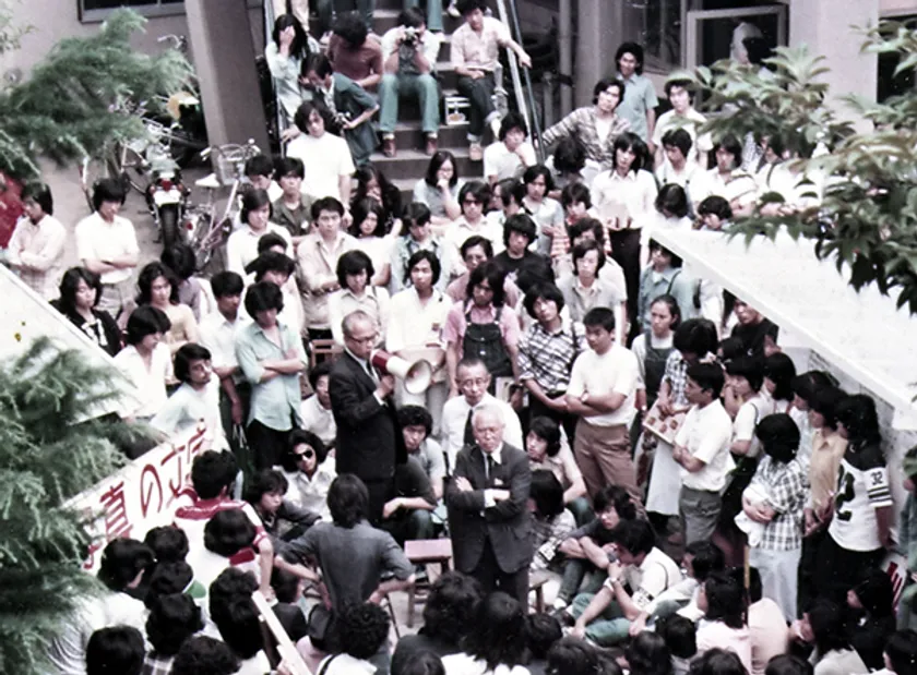 学生への説明会後、菊池学長を取り囲む学生たち 1976(昭和51)年6月21日