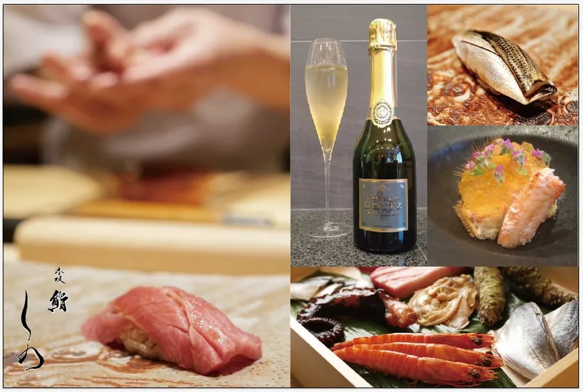 2022年10月オープンした『赤坂 鮨 しの』では、バレンタインに向け、期間限定で名門シャンパーニュ『Deutz(ドゥーツ)』が付いた「シャンパーニュコース」20,000円(税込)を2月15日まで提供します。目玉は「北海道産 毛蟹」、美しいジュレの下には濃厚でマイルドな蟹味噌ソースをあしらい2種類の味を楽しむ事が出来ます。その他、旬の刺身、焼き物、茶わん蒸し、雲丹や大トロなど9貫の握り、お椀の全15品に『ドゥーツ ブリュット・クラシック』ハーフボトルが付いたコースで、2時間くらいかけてゆっくり味わって頂きます。『Deutz(ドゥーツ)』との絶妙な相乗効果をお楽しみください。※コースは2名様以上、偶数の人数で予約可能です。